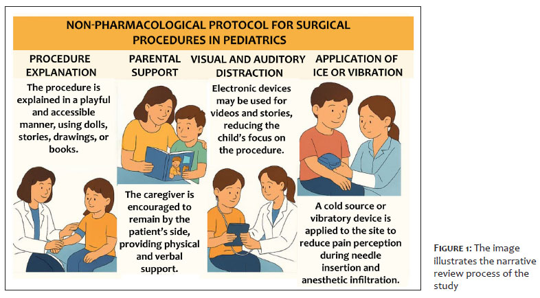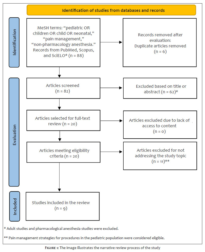 A narrative literature review was conducted using the PubMed, Scopus, and SciELO databases. Articles published within the last 5 years were selected using the following English descriptors (MeSH terms): “pediatric OR children OR child OR neonatal,” “pain management,” and “non-pharmacology anesthesia.” Inclusion criteria comprised clinical studies, systematic reviews, and meta-analyses addressing strategies for the management of pain and anxiety in children undergoing surgical procedures. Studies involving exclusively adult samples or addressing only pharmacological anesthesia without integration of non-pharmacological strategies were excluded. Figure 1 summarizes the results of the literature search.