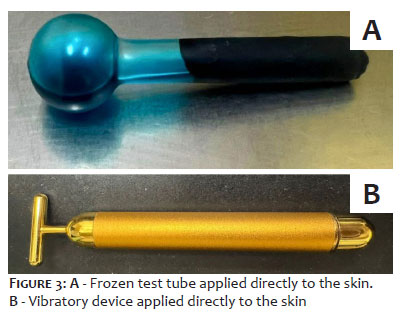 The protocol is summarized in Figure 2. Figure 3 illustrates the tools used in our hospital for the application of ice in (A) and vibration in (B).