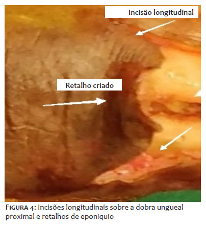 Exames preliminares não revelaram anormalidades. O quadro clínico era característico, e exames de imagem foram considerados desnecessários. Realizou-se bloqueio digital com xilocaína sem vasoconstritor. Um torniquete foi aplicado ao redor da base do dedo. Toda a lâmina ungueal, juntamente com a estria longitudinal, foi separada do leito ungueal e removida (Figura 3). Foram realizadas duas incisões longitudinais em cada lado da dobra ungueal proximal e criados retalhos para exposição da matriz germinativa (Figura 4).