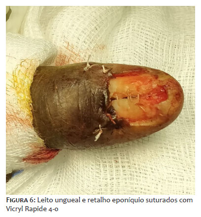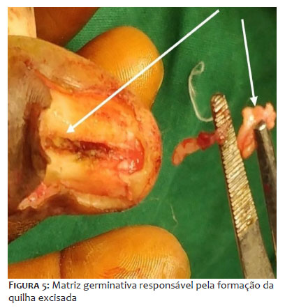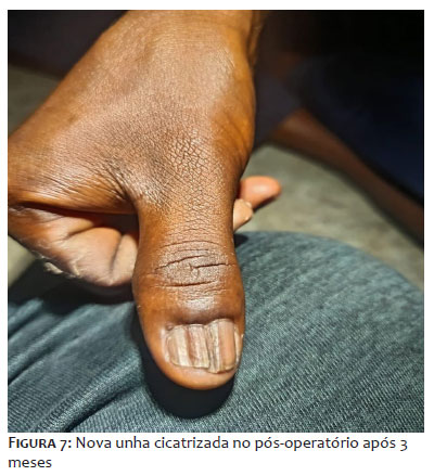 A extensão da cratera no leito ungueal e da matriz germinativa responsável pela deformidade em “quilha” (Figura 5) foi excisado. A ferida no leito ungueal foi suturada com Vicryl Rapide 4-0 (Figura 6). A cicatrização pós-operatória foi satisfatória. O crescimento ungueal estava completo em poucas semanas, com a forte aproximação das duas partes separadas (Figura 7), e o alívio da dor para o paciente foi total.