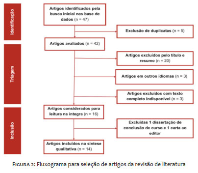A busca inicial produziu 47 resultados ao total, sendo 24 no Google Scholar e 23 no PubMed. Destes, 14 foram incluídos. Vinte e cinco estudos foram excluídos com base no título e 8 no resumo ou no texto completo (Figura 2).