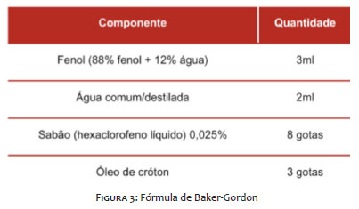 A fórmula de Baker-Gordon, ainda a mais utilizada nos peelings de fenol, contém componentes que intensificam a atividade do fenol na pele, como óleo de cróton e sabão líquido (Figura 3). Na ausência desses, a regeneração celular é menos eficaz.4