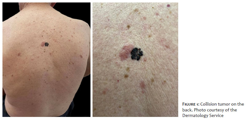 This case report describes a patient with a collision tumor of melanoma and basal cell carcinoma (BCC), addressing clinical, histological, and therapeutic aspects and highlighting the importance of differential diagnosis in complex cutaneous neoplasms.