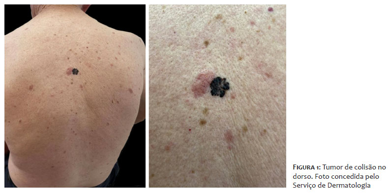 Um tumor de colisão é uma condição rara que ocorre quando dois ou mais tumores cutâneos coexistem na mesma região anatômica. O objetivo deste estudo é apresentar o caso de um paciente do sexo masculino, 70 anos, com um tumor de colisão entre melanoma in situ e carcinoma basocelular de padrão nodular, abordando os aspectos clínicos, histológicos e terapêuticos ressaltando a importância do diagnóstico diferencial em neoplasias cutâneas complexas. Dado o número limitado de casos na literatura, é difícil prever a evolução biológica dos tumores de colisão. Assim, faz-se necessário o seguimento rigoroso dos pacientes e mais estudos que contribuam para o entendimento sobre essa condição.