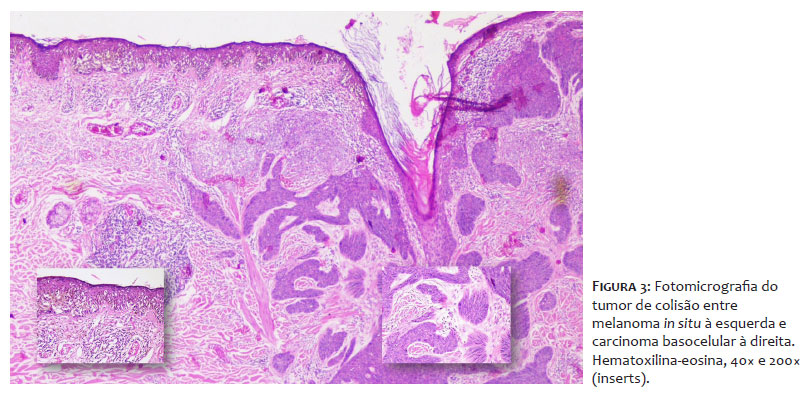 Entre os tumores de colisão, os relatos de melanoma com CBC são infrequentes. A colisão de tumores benignos ou malignos resulta da proliferação de células de linhagens diferentes, podendo coexistir na mesma lesão e formar combinações de tumores.3