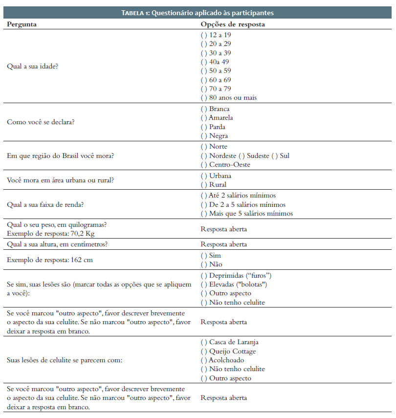 O questionário perguntava a idade, etnia autodeclarada, região de residência, local de residência (urbano ou rural), faixa de renda, peso, altura, presença de celulite em qualquer região corporal e aspecto das lesões das participantes. Todas as informações foram fornecidas em caráter de autoavaliação.