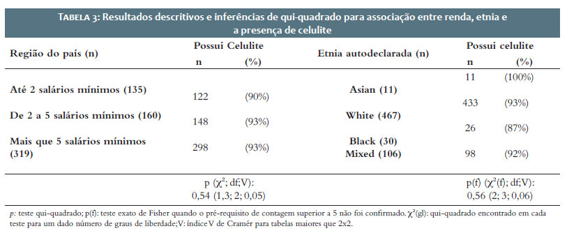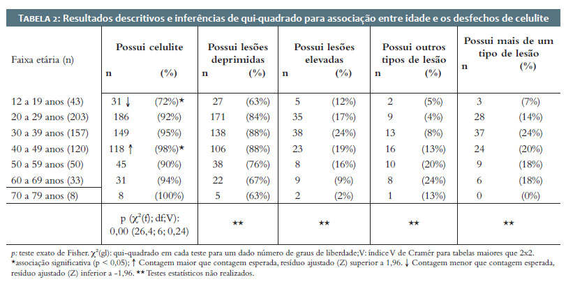 Para a análise estatística das variáveis categóricas (Tabelas 1 e 2), foi utilizado o teste de qui-quadrado para verificar a associação entre cada variável (idade, renda e raça/etnia) e a presença ou ausência de celulite. Durante o cálculo do teste de qui-quadrado, em relação às planilhas de associação e de contagem esperada para as variáveis, quando estas não respeitaram o pré-requisito de frequência esperada superior ou igual a 5, foi adotado o teste exato de Fischer. O nível de significância para todos os testes foi de α < 0,05. Foi calculado também o grau de associação coeficiente de Cramér (V) para Tabelas maiores que 2x2. Nas associações estatisticamente significativas, foi calculado o resíduo padronizado ajustado, também conhecido como resíduo Z, como forma de interpretação post-hoc. A diferença residual foi considerada significativa quando superior a 1,96 ou inferior a -1,96 (confirmação da hipótese nula = -1,96 > Z > 1,96), com valor Z equivalente ao nível de significância de alfa igual a 5% (α < 0,05).