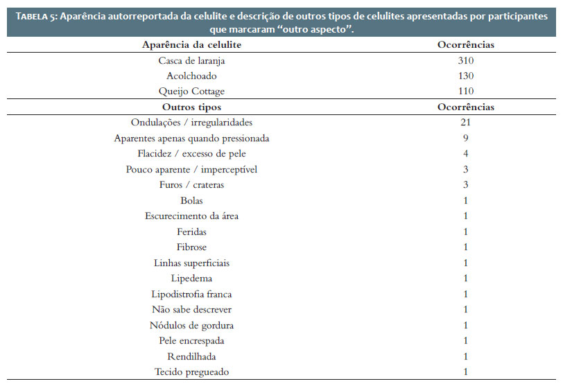 A grande maioria das participantes (92,5%) relatou ter celulite. Destas, 82,7% relataram lesões deprimidas e 19,4%, lesões elevadas. Pouco mais da metade (50,3%) relatou uma aparência do tipo “casca de laranja”. Quando estratificadas por região, 100% das participantes das regiões Norte e Centro-Oeste referiram ter celulite, assim como 93% nas regiões Sul e Sudeste e 88% na região Nordeste.