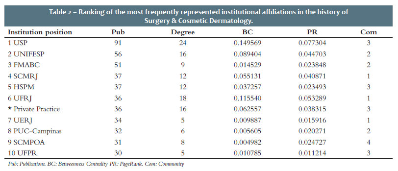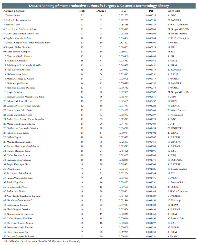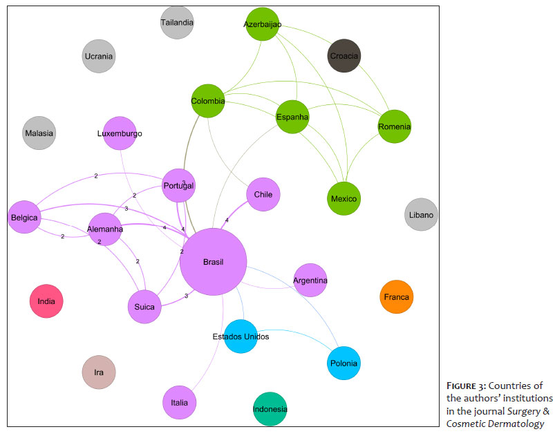 To address this gap, the present study applies scientometric methods and social network analysis (SNA) to examine the complete set of articles published in SCD since its inception. Similar approaches have been used to map institutional and thematic collaborations in various medical specialties. For example, international collaborations in neurosurgery have been analyzed through a social network analysis of the 50 most cited articles in the field.2 Scientometrics has also been discussed as a strategic instrument to analyze, quantify, and promote the presence of Brazilian dermatology in the international scientific arena.3 Scientometric studies have been conducted in the field of robotic surgery in different contexts.4,5 Social network analysis has likewise been used to identify patterns of international collaboration in emergency department publications in a single country.6 Finally, a historical and bibliometric analysis of the authors who contributed to Anais Brasileiros de Dermatologia (ABD) over its hundred-year history identified the most productive authors and their institutional affiliations.7