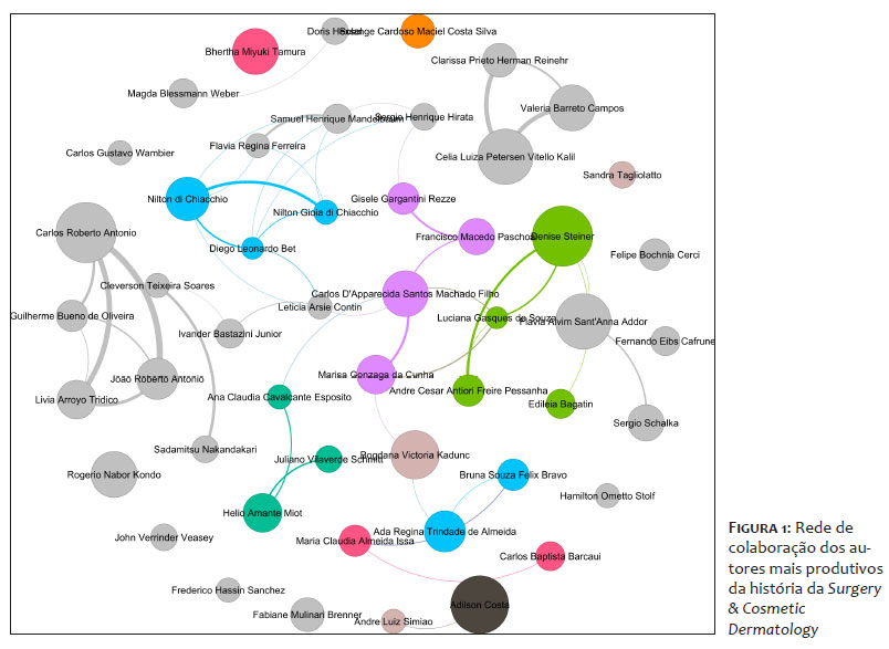 Para preencher essa lacuna, o presente estudo aplica metodologias cienciométricas e análise de redes sociais (SNA) para examinar o conjunto completo de artigos publicados na SCD desde sua criação. Abordagens semelhantes têm sido utilizadas para mapear colaborações institucionais e temáticas em diferentes especialidades médicas. Por exemplo, as colaborações internacionais em neurocirurgia foram analisadas por meio de uma análise de redes sociais dos 50 artigos mais citados na área.2 A cienciometria também já foi discutida como instrumento estratégico para analisar, quantificar e promover a inserção da dermatologia brasileira no cenário científico internacional.3 Estudos cienciométricos foram realizados na área de cirurgia robótica, em diferentes contextos.4,5 A análise de redes sociais também foi utilizada para elicitar o padrão de colaboração internacional em publicações de departamentos de emergência em um país.6 Por fim, uma análise histórica e bibliométrica dos autores que contribuíram para os Anais Brasileiros de Dermatologia (ABD) ao longo de seus cem anos de publicação identificou os autores mais produtivos e suas instituições de afiliação.7