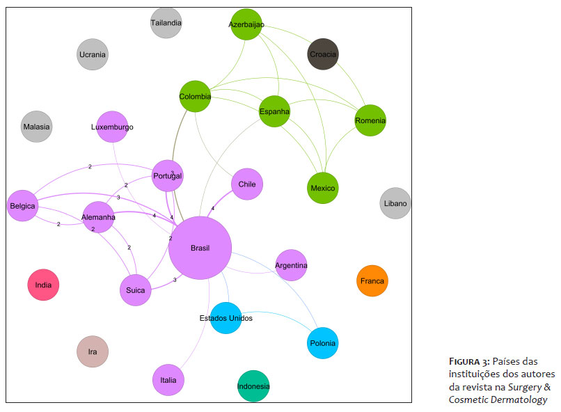 A Figura 2 apresenta a rede de colaboração científica entre instituições que contribuíram para a SCD. A estrutura da rede evidencia a formação de quatro comunidades interinstitucionais distintas, com base na detecção de modularidade. A Comunidade 1, destacada em magenta, é liderada pela UFRJ e compreende predominantemente instituições sediadas no estado do Rio de Janeiro, além de entidades de outros estados, como Minas Gerais e diversos estados do Nordeste, configurando uma rede com abrangência geográfica relativamente ampla. A Comunidade 2, em verde, liderada pela UNIFESP e pela FMABC, concentra instituições localizadas principalmente no estado de São Paulo, além de instituições do Distrito Federal e, de forma pontual, da Bahia, Alagoas e Paraná. A Comunidade 3, em azul, tem como principal vértice a USP, e reúne uma densa rede de instituições paulistas, incluindo também diversas clínicas privadas, com conexões limitadas com outras regiões, como Paraná e Rio Grande do Sul. A Comunidade 4, em cinza escuro, é centrada na SCMPOA, sendo composta em sua maioria por instituições do Rio Grande do Sul. Observa-se ainda um subconjunto de instituições isoladas ou perifericamente conectadas, que não apresentam vínculos de coautoria evidentes com outras organizações, sugerindo uma baixa inserção em redes colaborativas institucionais, o que pode impactar negativamente na circulação do conhecimento e na visibilidade científica. A segmentação observada reflete tanto vínculos geográficos e institucionais quanto padrões consolidados de colaboração regional e afinidades temáticas dentro do campo da dermatologia cirúrgica e cosmiatria.