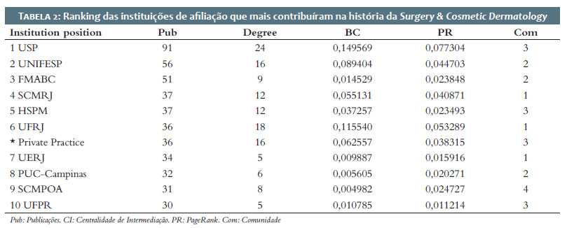 A análise das quatro métricas permite uma avaliação abrangente da rede de instituições que contribuíram para a SCD. A métrica de publicações é um indicador direto de produtividade acadêmica. O grau quantifica o número de colaborações diretas estabelecidas com outras instituições. A centralidade de intermediação, por sua vez, revela o papel estratégico de determinadas instituições como elos entre diferentes subgrupos, facilitando o fluxo de conhecimento e a integração de comunidades científicas. Por fim, o PageRank mede a influência estrutural das instituições com base na qualidade de suas colaborações. Consideradas em conjunto, essas métricas permitem distinguir instituições de alta produtividade daquelas com papel central na dinâmica colaborativa, contribuindo para a consolidação e difusão do conhecimento na área da cirurgia dermatológica e cosmiatria.