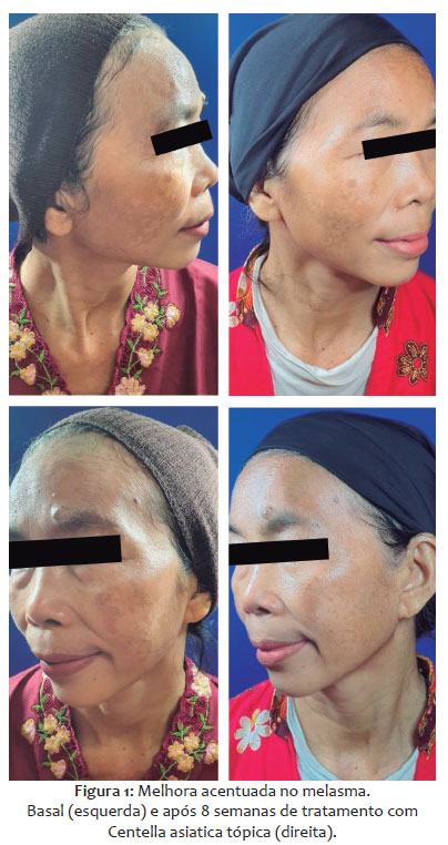 Ambas a CA e a hidroquinona reduziram significativamente os escores MASI após 8 semanas de tratamento. Não houve diferença estatisticamente significativa entre os dois grupos com relação à eficácia. A satisfação do paciente melhorou em ambos os grupos, sem diferenças significativas entre eles. Dados os níveis semelhantes de eficácia e menor risco de irritação, a Centella asiatica pode representar uma alternativa adequada para pacientes que desejam evitar os efeitos adversos associados com frequência à terapia com hidroquinona.
