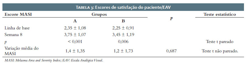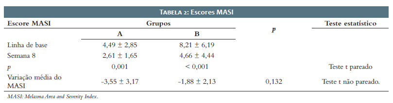 A avaliação da resposta terapêutica e da melhora clínica no melasma é importante. O escore MASI é composto por três indicadores: área da lesão (A), intensidade da pigmentação (D) e homogeneidade da hiperpigmentação (H).2 Neste estudo, no grupo CA, o escore MASI basal foi de 8,21 (6,19) e de 4,66 (4,44) na semana 8. A redução média (DP) dos escores MASI foi maior no grupo CA (-3,55 [3,17]) em comparação com o grupo controle (-1,88 [2,13]). No entanto, essa diferença não foi estatisticamente significativa.