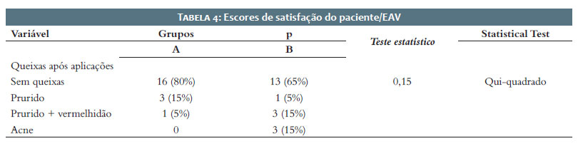 As queixas associadas à hidroquinona e à CA são apresentadas na Tabela 4. No total, 80% do Grupo A e 65% do Grupo B não relataram queixas. Prurido e vermelhidão foram mais frequentes no Grupo B (15%) em comparação com o Grupo A (5%). Acne foi relatada apenas no Grupo B (15%).
