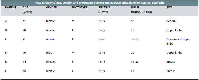 A prospective study was conducted from March 2012 to March 2013, at the Cosmetic Dermatology ambulatory of the Instituto de Dermatologia Prof. Rubem David Azulay, Santa Casa de Misericordia do Rio de Janeiro, with the approval of the Medical Ethics Committee of the institution. Six patients of both genders (4 women and 1 man), with ages between 21 and 48 years (mean = 33 years), with varied distribution of photo-types according to the Fitzpatrick classification (Table 1), who showed scarring from thermal burns which had occurred more than six months before and who had undergone prior conventional treatment in centers for treatment of burns, and who were not under ongoing topical treatment at the time of the study, were included in the present research.