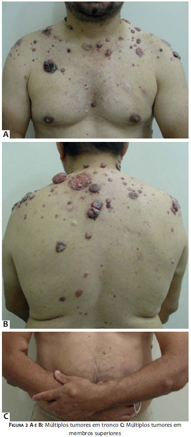 Paciente do sexo masculino, 39 anos, branco, natural e procedente da Bahia, agricultor, encaminhado ao Instituto Nacional do Câncer (INCA) com queixa do surgimento de lesões tumorais difusas pelo corpo, de crescimento progressivo há aproximadamente 20 anos. Relatava exérese prévia de algumas lesões e negava tanto história familiar semelhante quanto outras comorbidades.