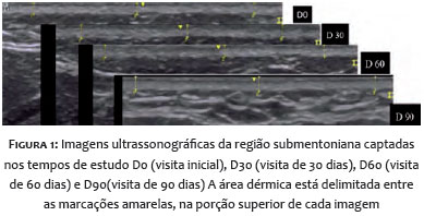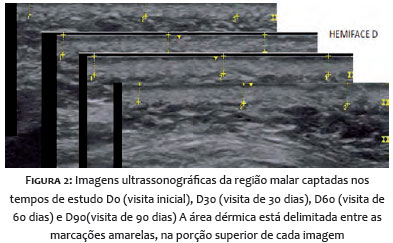 Após assinatura do termo de consentimento livre e esclarecido e avaliação dermatológica para descartar dermatoses na área de avaliação, foi realizado exame ultrassonográfico (equipamento Voluson E (GE Healthcare) multicanal com doppler colorido e com transdutor de frequência de até 15MHz considerando dois locais para padronização: áreas malar e submentoniana. A avaliação ultrassonográfica foi realizada com o intuito de calcular a espessura da derme das áreas escolhidas e captar eventuais diferenças nos tempos de estudo.