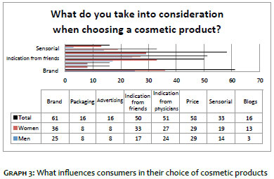 When questioning about what makes consumers to look for a specific cosmetic product, the following picture was obtained: women are more influenced by brands, followed by indication from friends and price, while men are mainly influenced by price, brand and medical indication (Graph 3).