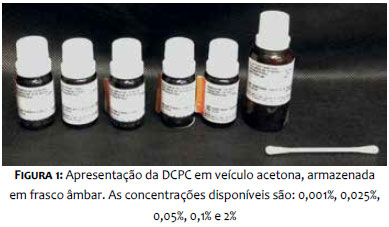 Utilizamos DPCP em veículo acetona, armazenado em frasco âmbar. As concentrações disponíveis são: 0,001%, 0,025%, 0,05%, 0,1%, e 2%; a droga é proveniente de farmácia de manipulação já nas referidas diluições (Figura 1).