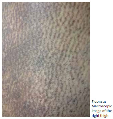 On physical examination, the patient had brownish patches, some of them reticulated, interspersed with normal skin all over the body, sparing only fingers, feet and scalp (Figure 1). On dermoscopy, multiple brown waves on the inferior aspect of the right leg, formed by brownish squared structures with fine streaks in the center of the lesion were of interest (Figures 2 and 3). She denied previous health issues or use of regular medications. Histopathology showed with apoptotic keratinocytes in the epidermis and enlargement of the papillary dermis, with deposition of hyaline eosinophilic globules, besides melanophages and mild superficial perivascular lymphomononuclear infiltrate (Figure 4).