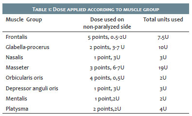 According to Jowett et al.7, the recommended starting dose for correction of contralateral eyebrow weakness is 9U of toxin into the frontal muscle, distributed in three zones, following a triangular pattern, always 1.5 cm above the eyebrow to prevent eyelid ptosis. The starting dose for the platysma muscle would be 20U distributed in four zones (rectangular pattern), 2 cm below the mentum.