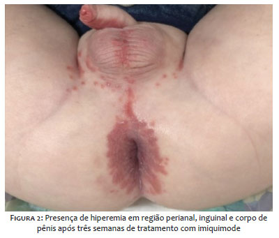 Paciente masculino, um ano e seis meses. Acompanhante (mãe) refere lesões perianais e em escroto há seis meses, com aumento progressivo das mesmas em número e tamanho. Ao exame físico, foram observadas pápulas eritematosas em região escrotal e inguinal, outras confluentes formando uma placa de aspecto vegetante, com coloração rósea, acometendo região perianal (Figura 1). Nascido de parto normal, a termo e sem intercorrências. Mãe com história de câncer de ovário nega lesões genitais ou extragenitais. O pai e os dois irmãos foram avaliados também, sem evidências de lesões suspeitas. Foram solicitadas sorologias (sífilis, HIV, hepatites B e C) de paciente e dos pais, todas negativas. Em seguida, foram encaminhados ao médico-legista sendo descartado abuso sexual pelo mesmo. Paciente encaminhado ao cirurgião pediátrico para avaliação e realização de biópsia. Enquanto aguardava-se a consulta com o profissional, decidimos iniciar imiquimode creme a 5%, duas vezes por semana, e em três semanas já foi observada importante melhora da lesão vegetante e papulosa. Como efeito adverso, foi observado eritema moderado (Figura 2), sendo o tratamento realizado até completarem-se sete semanas (Figura 3).