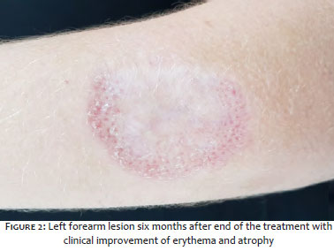 The improvement in erythema was progressive, already noticed after the first session. After observing that there was no significant clinical difference between the portions of the lesion in the fourth session, we chose to conduct only IPL. The entire lesion was treated with IPL associated with Erbium-YAG 2940nm laser from the fifth session onwards. There was an improvement in central atrophy, less visible vessels, decreased thickness and erythema of the border (Figure 2), in addition to no further progression of the lesion. The patient is undergoing clinical follow-up.