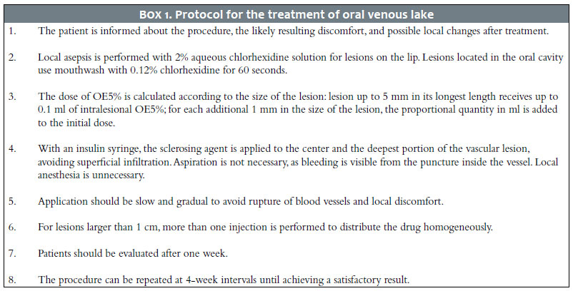 Box 1 describes the treatment protocol for oral venous lake using OE5% with a sclerosing agent (Ethamolin®, Farmoquímica - Brazil). We use the technique in 10 consecutive patients attending the Stomatology Outpatient Clinic of the Department of Dermatology at UNIFESP during 2019 (Box 1).
