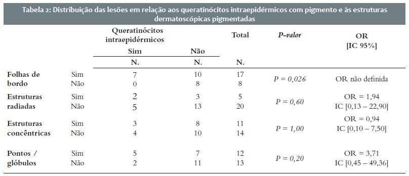 Na análise estatística entre as diferentes estruturas dermatoscópicas pigmentadas e o tipo de pigmento melânico presente no anatomopatológico, não houve correlação estatística significativa para nenhuma das variáveis. No entanto, entre folhas de bordo e queratinócitos intraepidérmicos com pigmento foi obtido p=0,057 (Tabela 2), próximo ao nível de significância de p<0,05. Yelámos et al. demonstraram que as estruturas dermatoscópicas estão relacionadas aos ninhos tumorais de células basaloides na junção dermoepidérmica18, porém estudos mais robustos com n amostral maior podem estabelecer conexão de outros padrões anatomopatológicos com a dermatoscopia, como sugerido neste estudo.