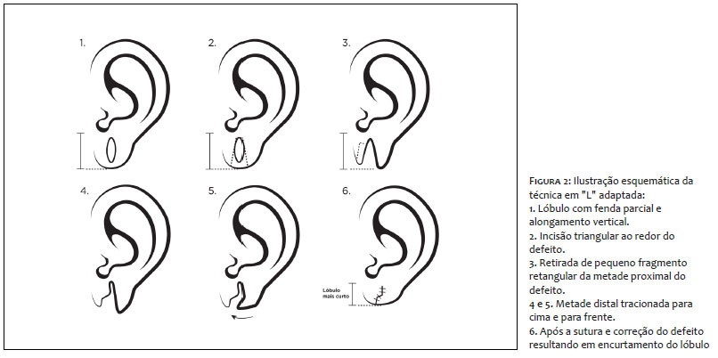 Em conclusão, a técnica em “L” adaptada foi escolhida por ser simples, pelo tipo de fenda apresentado, alongamento vertical do lóbulo e menor chance de recidiva. Além disso, essa técnica proporciona correção rápida do defeito primário, com cicatrizes discretas e com alta probabilidade de satisfação do paciente.