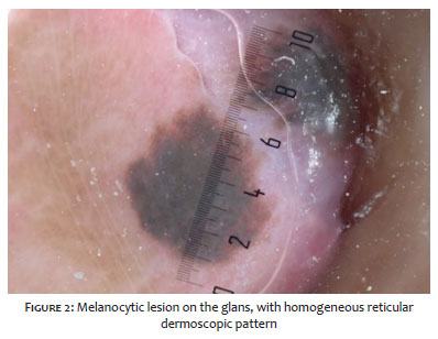 Among the therapeutic options available in the literature, the most indicated one given the benign lesions is the expectant management (watchful waiting), with clinical and dermoscopic follow-up. Surgical excision with mucosal and/or flap grafts, postectomy, and laser therapy (Nd:YAG, alexandrite, CO2) should be chosen, considering the patient’s functional and psychological aspects.4,5, 9,10 All patients are under clinical follow-up.