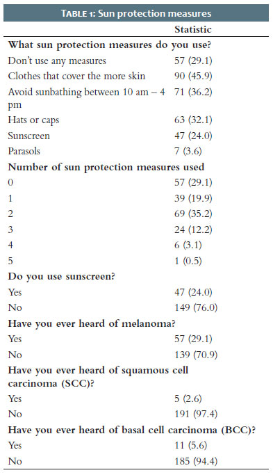 Regarding knowledge of skin cancers, 70.9% (n=139) had never heard about melanoma; 97.4% (n=191) had never heard about squamous cell carcinoma; and 94.4% (n=185) had never heard about basal cell carcinoma.