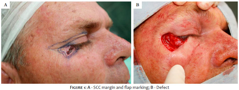 Squamous cell carcinoma (SCC) is the second most common type of skin cancer.1 Depending on its size and location, the complete excision of this type of tumor requires using a flap to close the resulting defect.1,2 Reconstructions in the lower eyelid region become more challenging for the dermatological surgeon due to local characteristics such as aesthetic and functional aspects.3