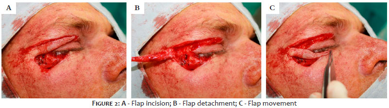 • Transposition movement of the flap from the upper eyelid portion to the defect in the lower eyelid region (Figure 2C);