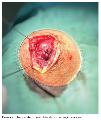 Sexo masculino, 14 anos, eutrófico e sem comorbidades, foi encaminhado ao serviço terciário de Dermatologia devido ao surgimento de tumoração no ombro direito há um ano, com crescimento progressivo, apresentando dor e limitação à movimentação. Ultrassonografia prévia evidenciava formação nodular hipoecoica de 4,5 x 1,4cm, com finas traves fibrosas de permeio, sem fluxo vascular significativo, localizada na região subcutânea do ombro direito com características sugestivas de lipoma. Devido à pandemia da Covid-19, paciente foi atendido nove meses após o exame de imagem, apresentando aumento exuberante da tumoração, medindo 10 x 10cm na região posterior do ombro direito (Figura 1). Realizada exérese imediata da lesão que, durante o intraoperatório, apresentou-se como tumoração violácea, algo friável e aderida a planos profundos (Figura 2).