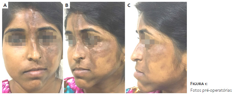 Outro cirurgião realizou enxerto ósseo da crista ilíaca na paciente dois anos antes, para corrigir o defeito em “coupe de sabre” na região frontal e também elevar a eminência malar esquerda. Ela estava, no entanto, insatisfeita com os resultados de sua cirurgia anterior e desejava melhorar o contorno e a simetria dos tecidos moles faciais. Ao exame, ela apresentava manchas cutâneas fibróticas hiperpigmentadas com atrofia do tecido subcutâneo na testa, bochecha, nariz e queixo esquerdos. Também pele atrófica e hiperpigmentada, aderida aos enxertos ósseos previamente realizados em áreas irregulares de sua testa e bochecha, sem tecido subcutâneo abaixo (Figuras 1A-C). Sua abertura bucal era adequada e não apresentava boca seca. Não houve evidência de distrofia significativa ou desvio da mandíbula na radiografia. A paciente recusou outras cirurgias reconstrutivas, como transferência de tecido livre microvascular e preenchimentos dérmicos cosméticos, após amplo aconselhamento sobre suas opções de tratamento, preferindo enxertos de gordura.